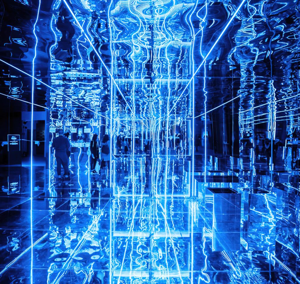 A sound driven infinity bar inside a 1473 church in Barcelona for Bombay Sapphire, creating contrast between technology and heritage. Inspired by the shapes of blue sapphires, we created a space where people could see themselves reflected and distorted by the mirrors, experiencing an intense ego trip during Barcelona’s fashion week.